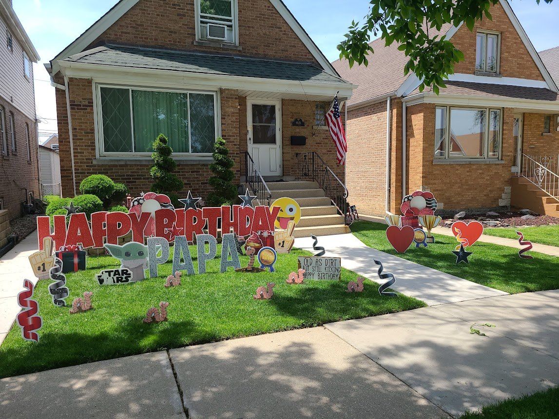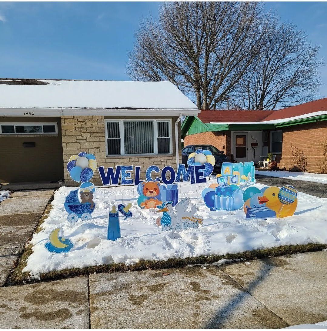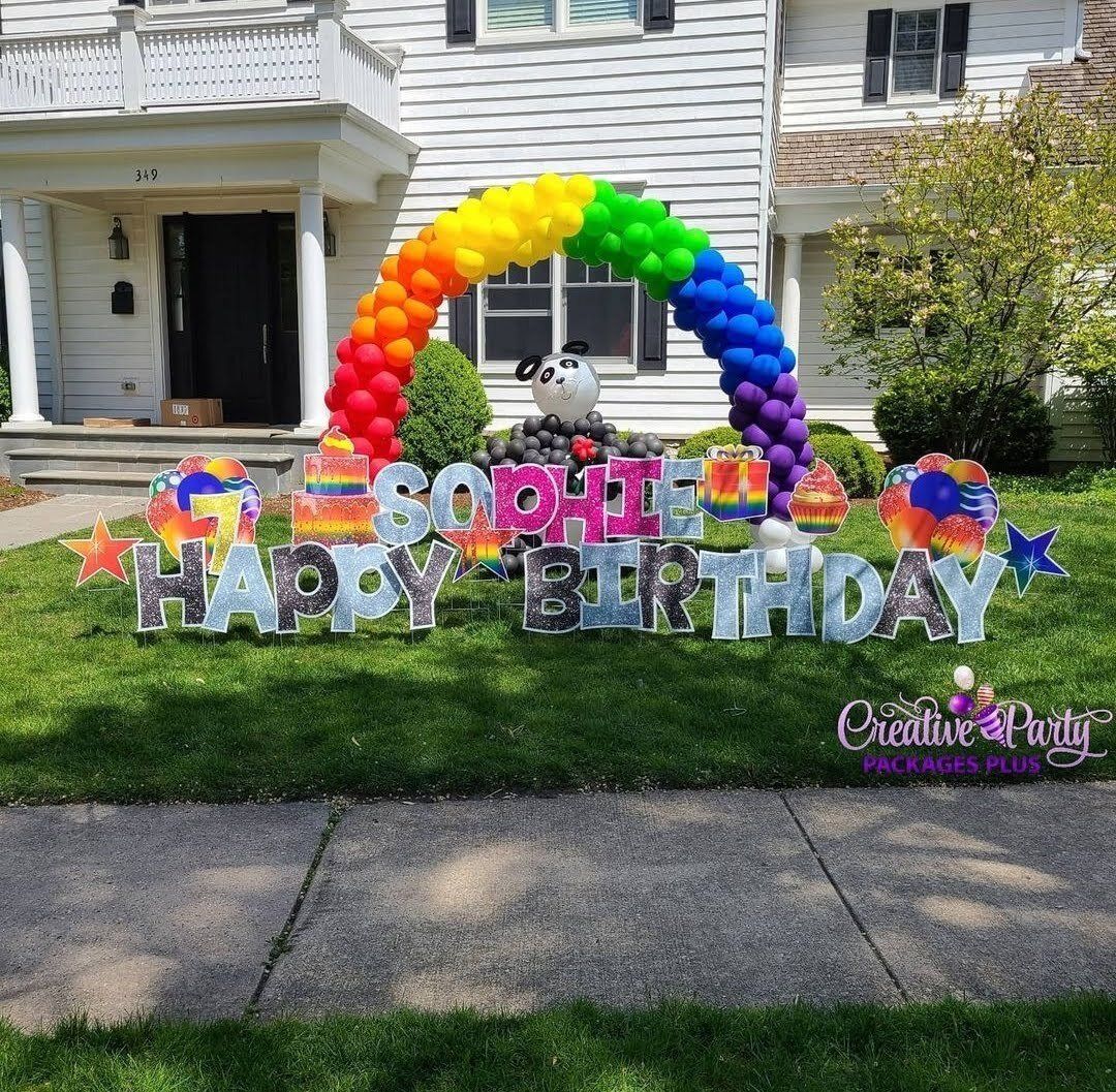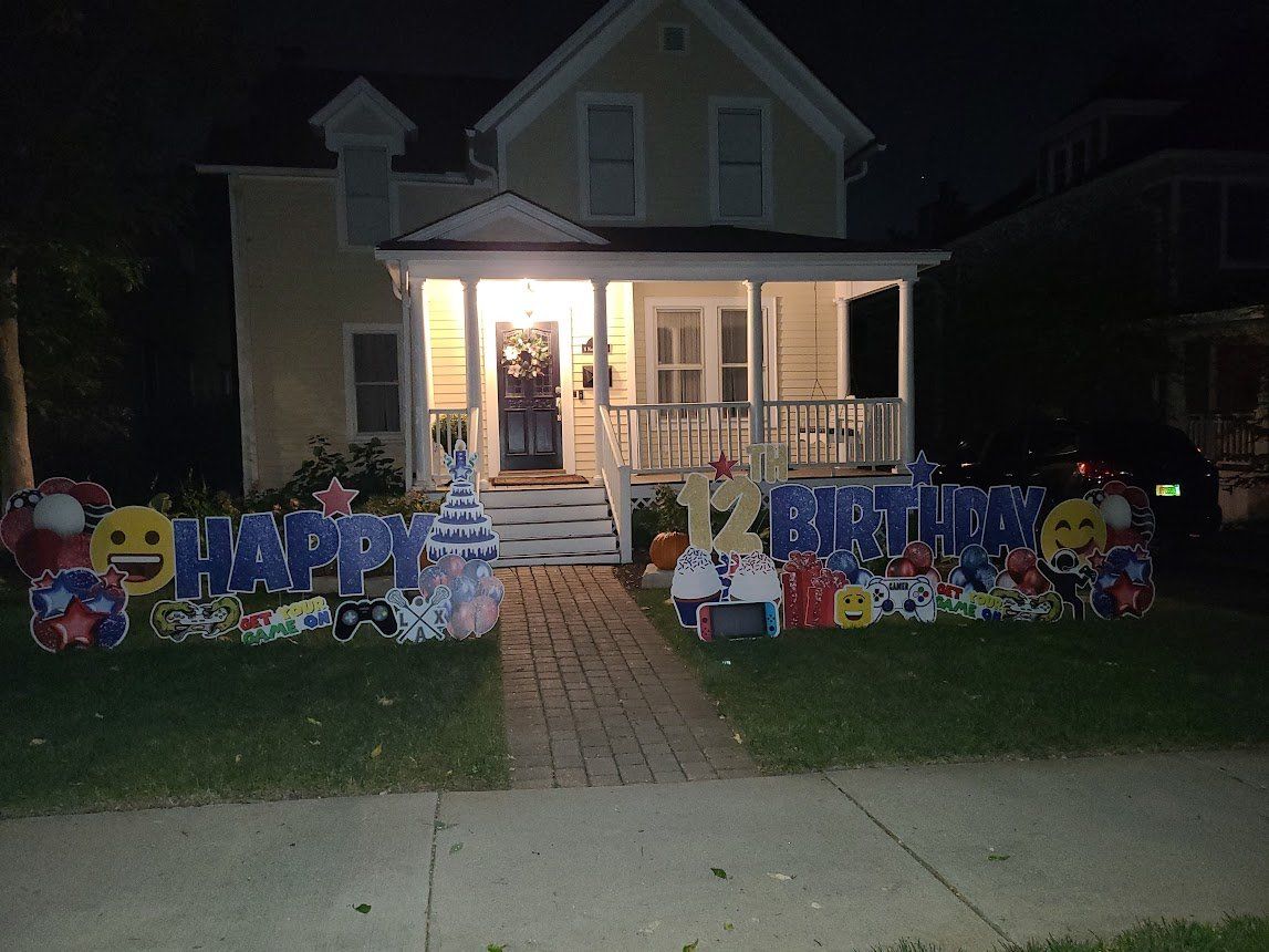 You can also have balloon arches and or columns added into your yard card set-up. We can anchor down the balloons so the wind doesn’t take off with them. Consider a balloon arch in front of your front door, or maybe balloon columns lining your sidewalk. Impress your guests with decorative yard cards as soon as they pull up. Better yet, new guests won’t have to call and verify which house – they’ll know by all the balloons and yard cards!