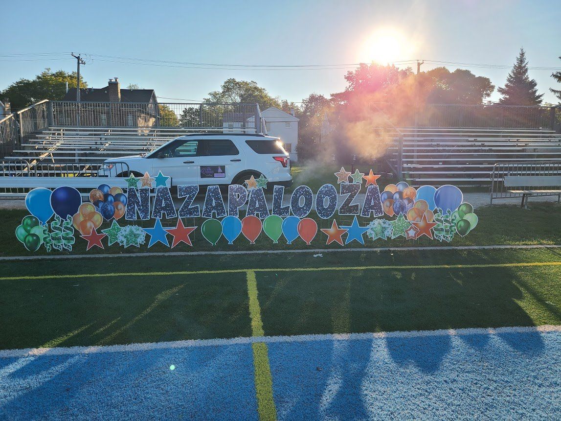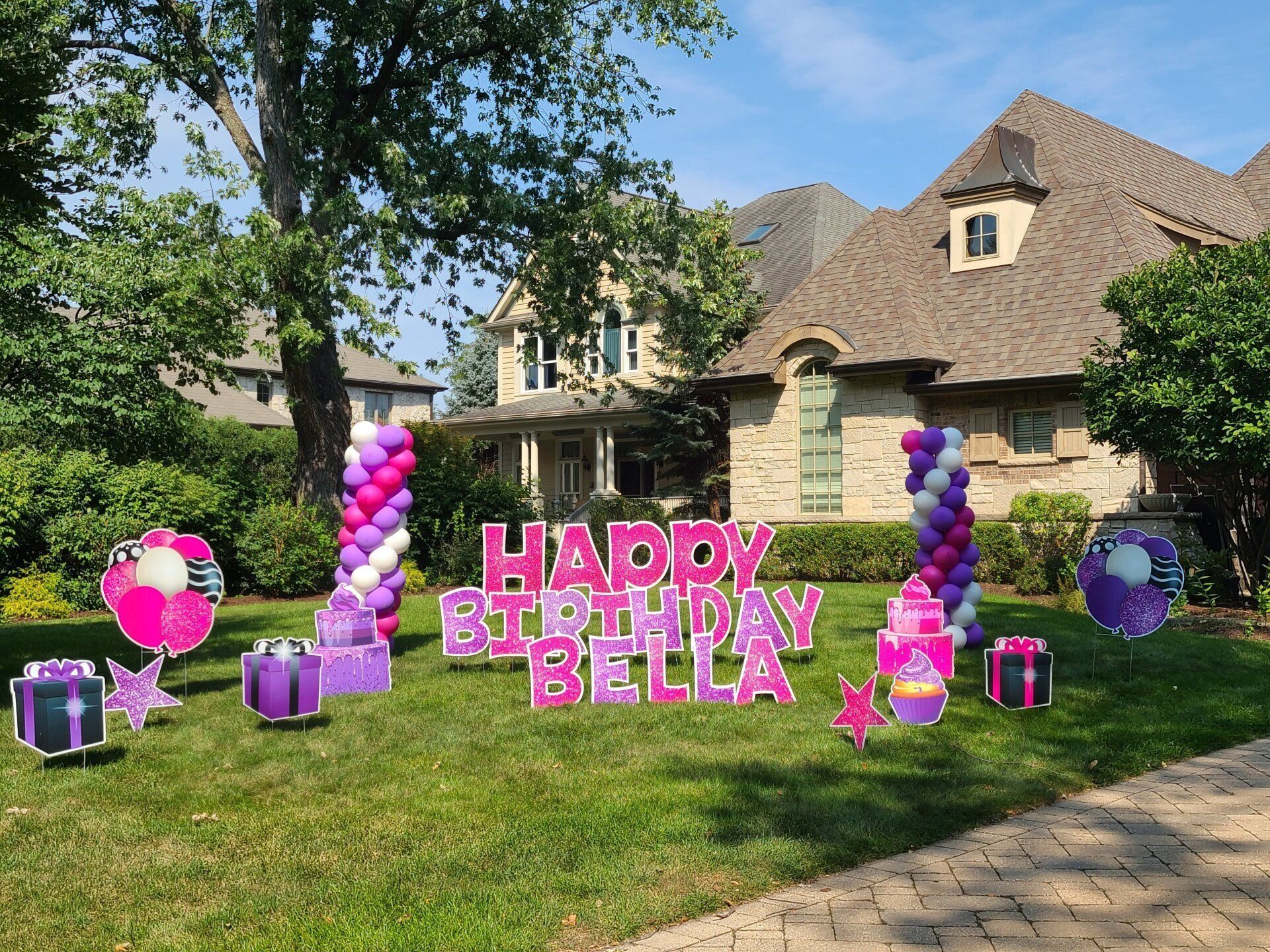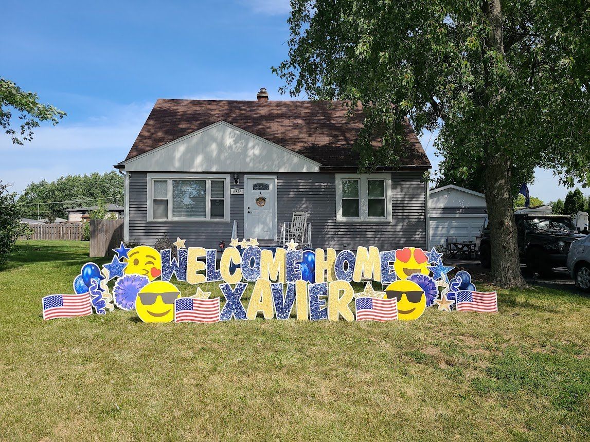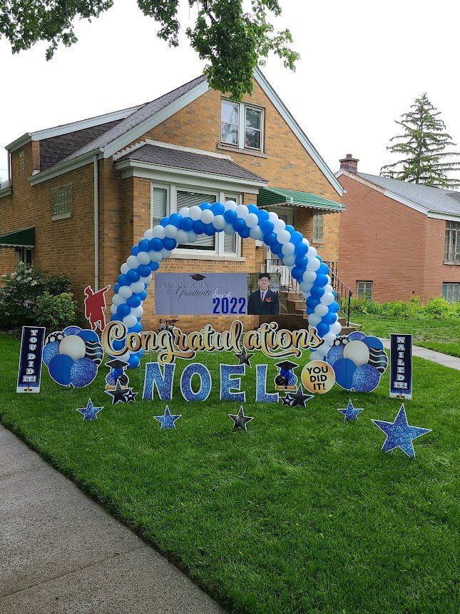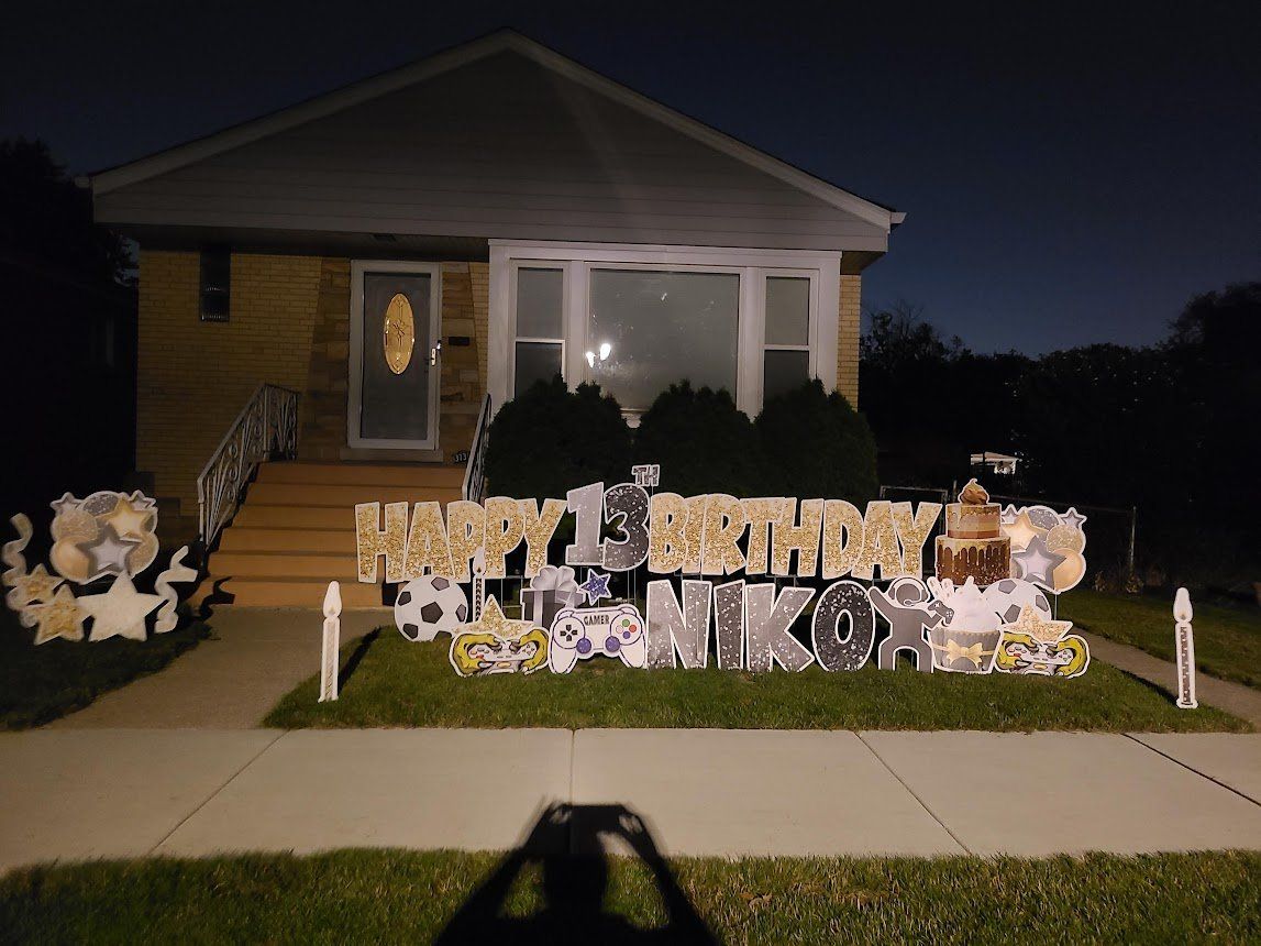 You can also have balloon arches and or columns added into your yard card set-up. We can anchor down the balloons so the wind doesn’t take off with them. Consider a balloon arch in front of your front door, or maybe balloon columns lining your sidewalk. Impress your guests with decorative yard cards as soon as they pull up. Better yet, new guests won’t have to call and verify which house – they’ll know by all the balloons and yard cards!