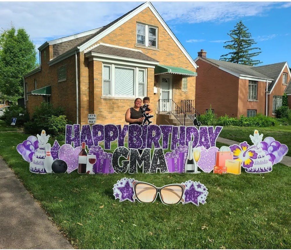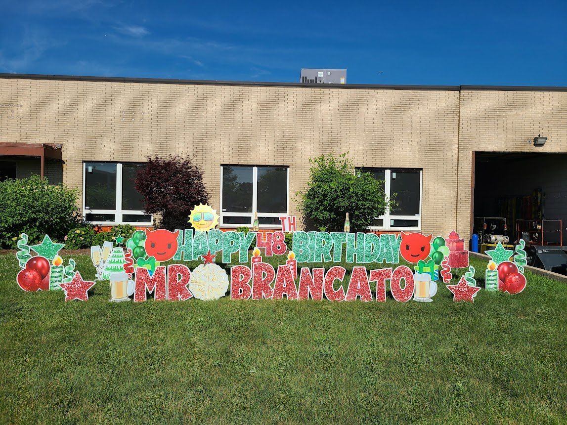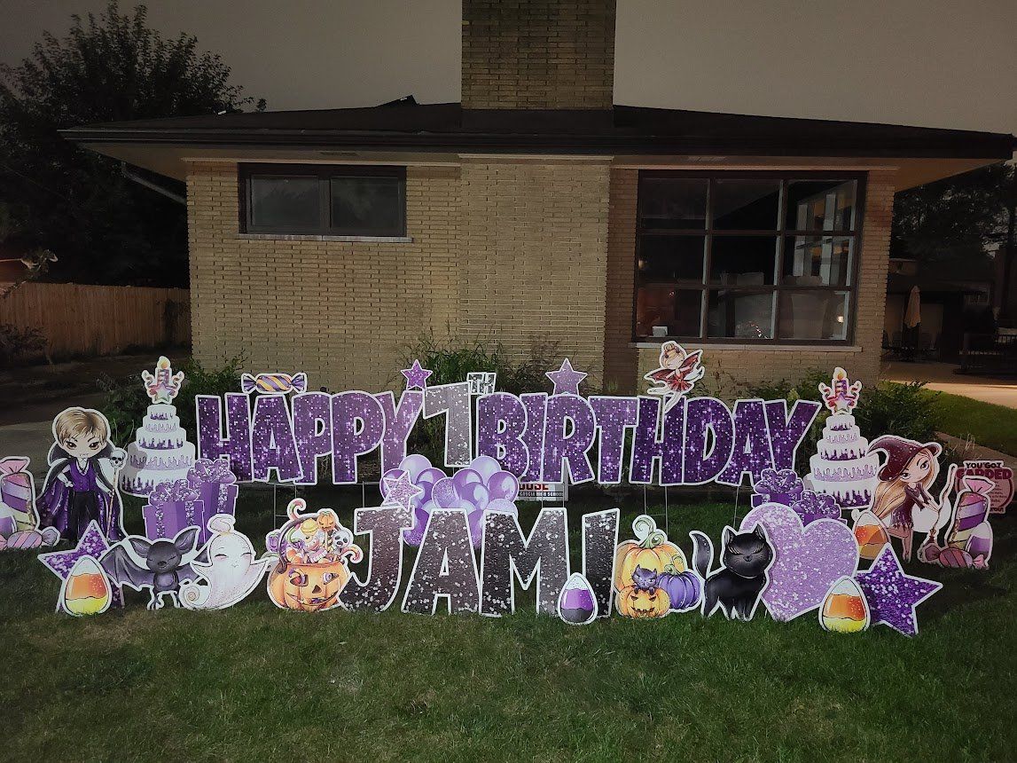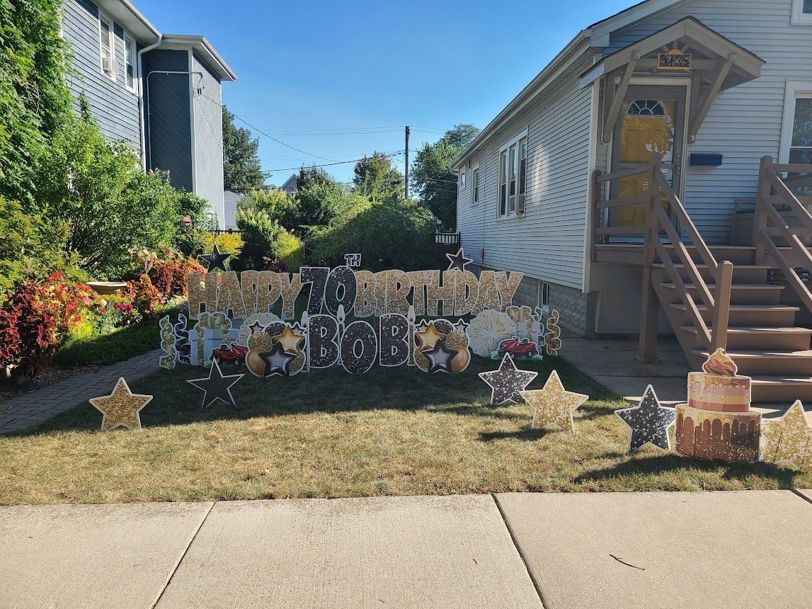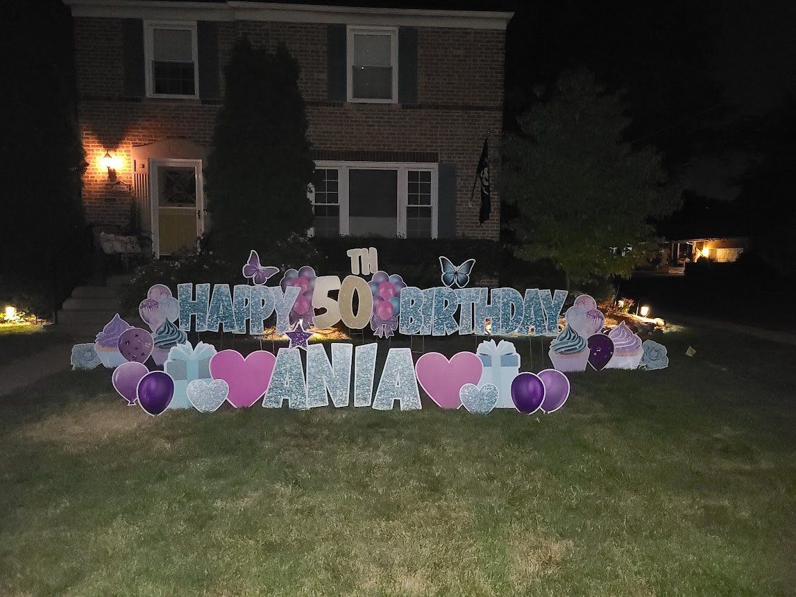 Yard cards are big letters planted into the ground like a sign, spelling out a message, such as “Happy Birthday”. They became hugely popular in 2020 with drive-by birthday/graduation wishes and honks. They catch attention more so than a little sign. The letters can be any color you like. See pictures below for example.