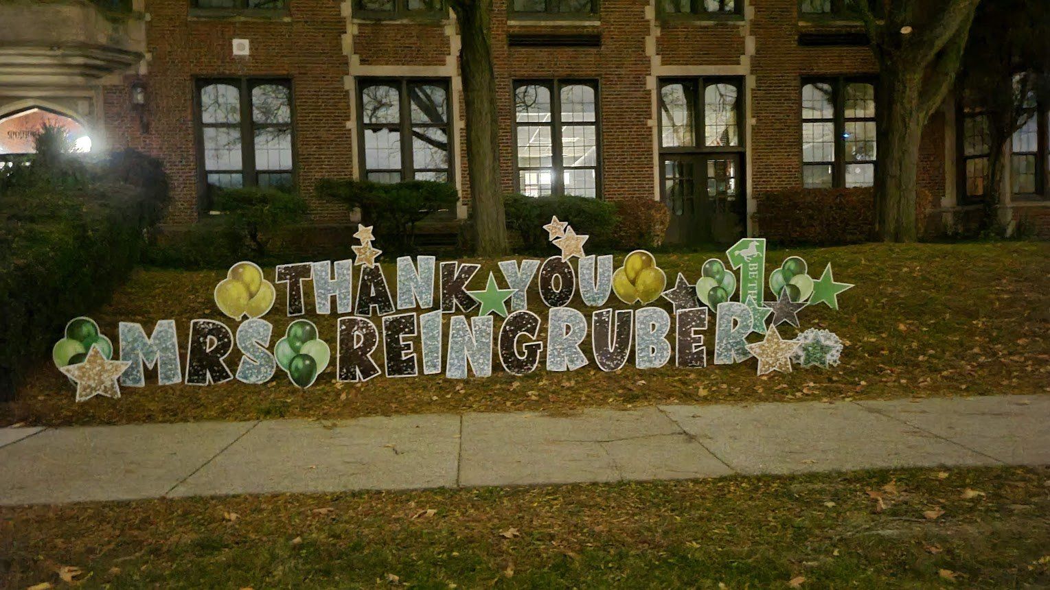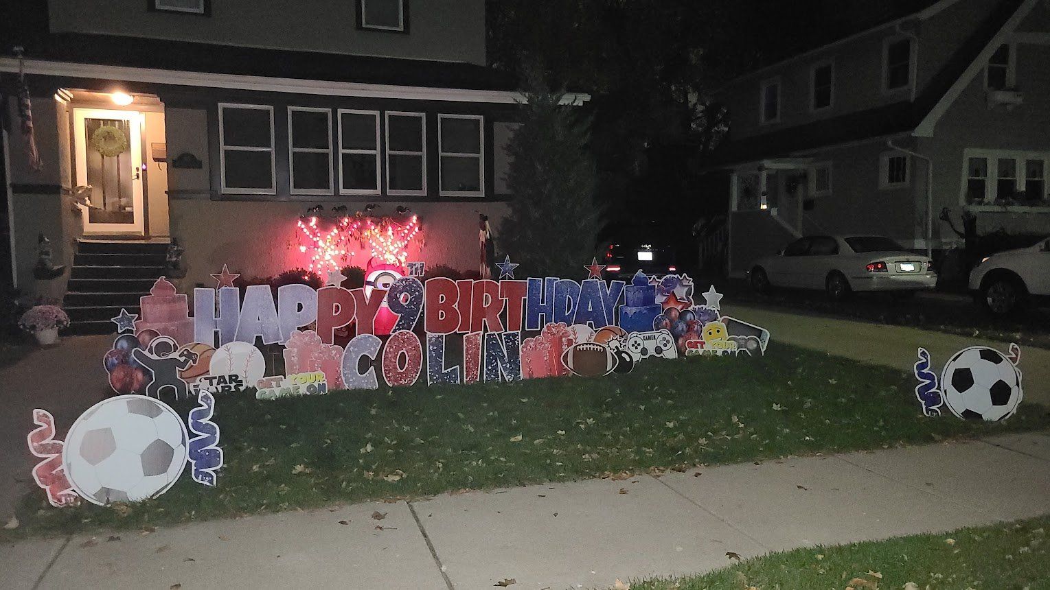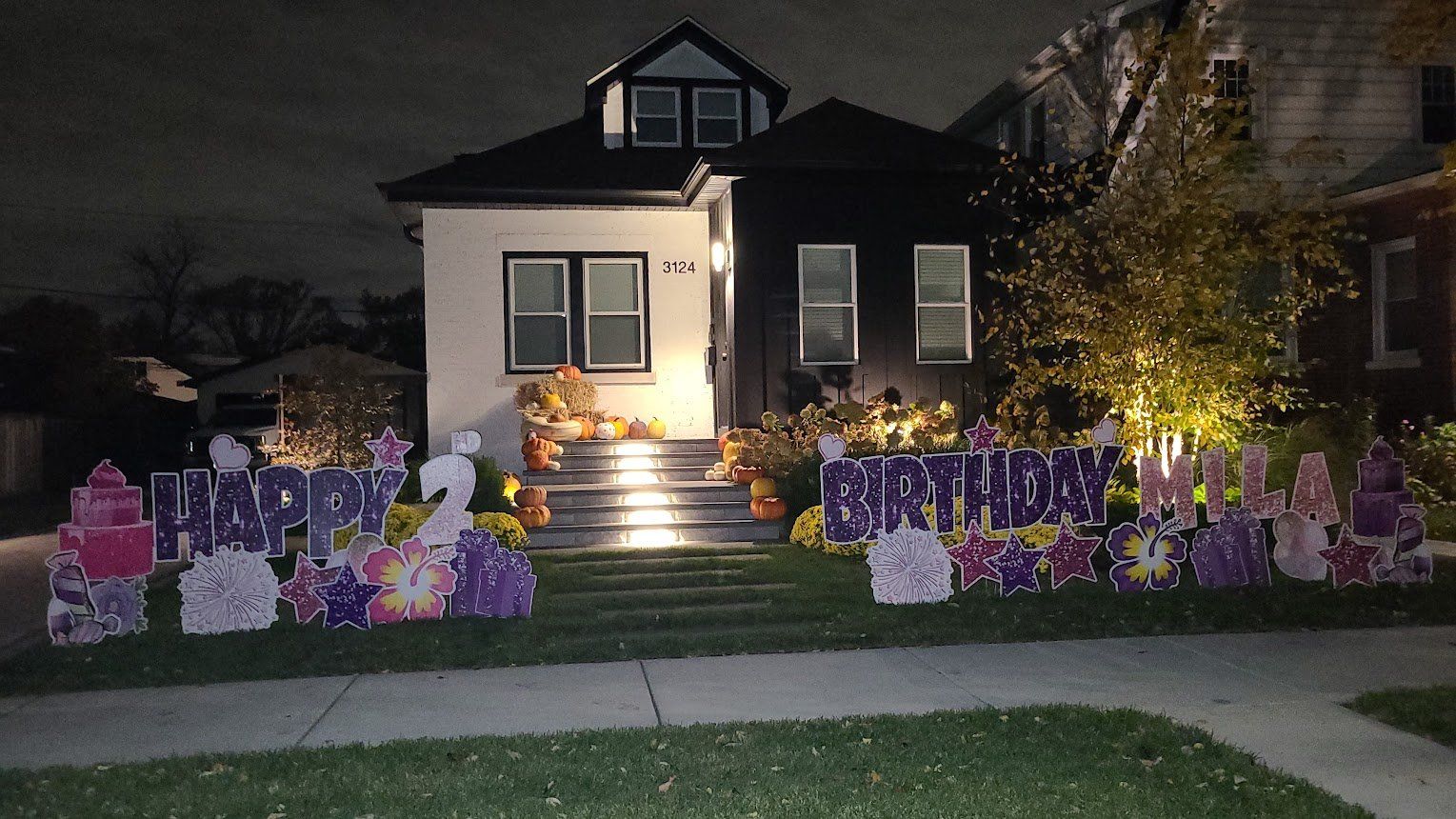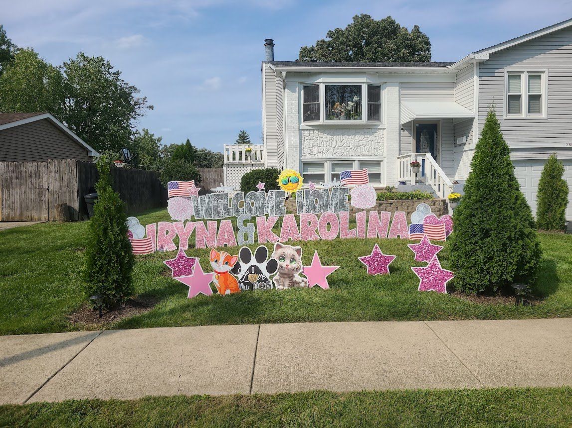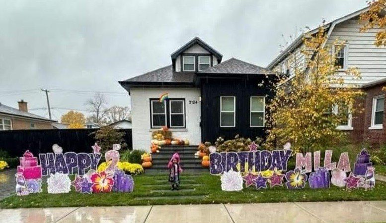 Yard cards are big letters planted into the ground like a sign, spelling out a message, such as “Happy Birthday”. They became hugely popular in 2020 with drive-by birthday/graduation wishes and honks. They catch attention more so than a little sign. The letters can be any color you like. See pictures below for example.